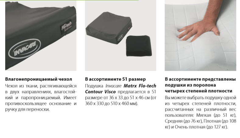 Подушка Flo-tech Lite Visco виготовлена з матеріалу, що має високу щільність і чутливість до температури тіла, що дає змогу їй адаптуватися до форми тіла користувача. Це забезпечує винятковий ступінь комфорту, одночасно знижуючи частоту виникнення пікових значень тиску. Істотно полегшуючи бічну посадку, плоска подушка цього типу ідеально підходить як для звичайного крісла, так і для крісла-коляски.