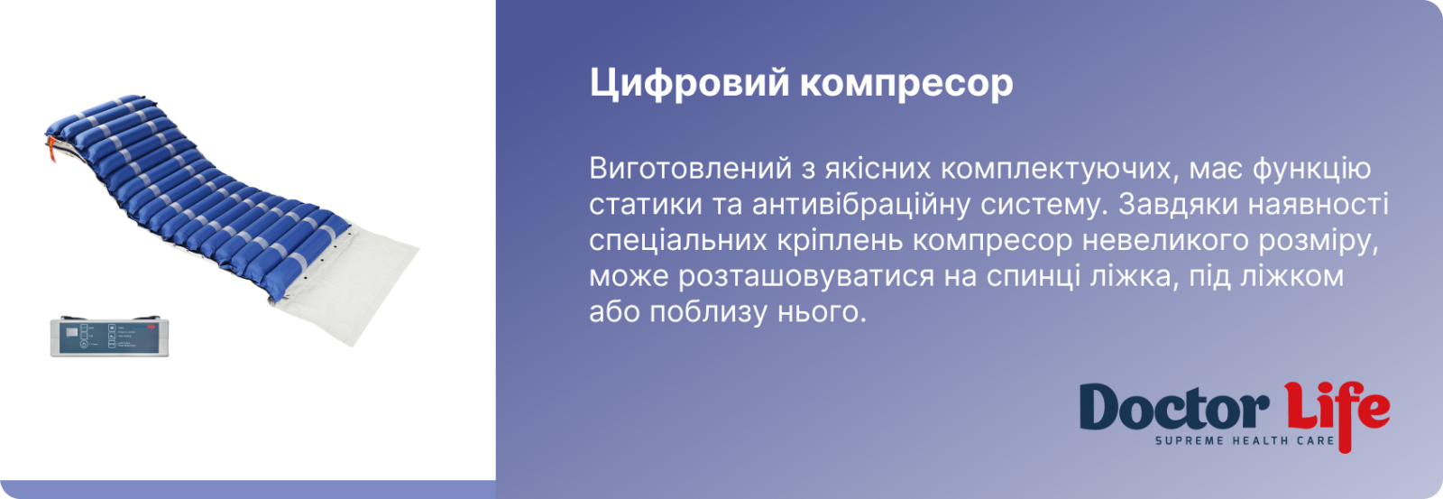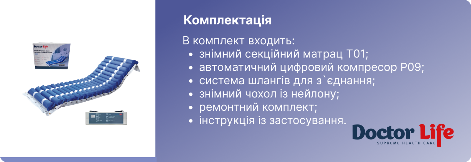 Якщо ви шукаєте надійний, функціональний і зручний протипролежневий матрац із компресором, модель Doctor Life T01-P09 стане ідеальним вибором. Це поєднання сучасних технологій, високої якості матеріалів і простоти у догляді.